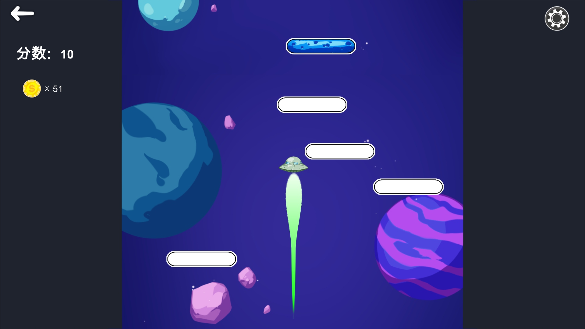 这是一款休闲跳跃类游戏,小球上升穿过或者接触跳板
